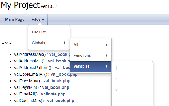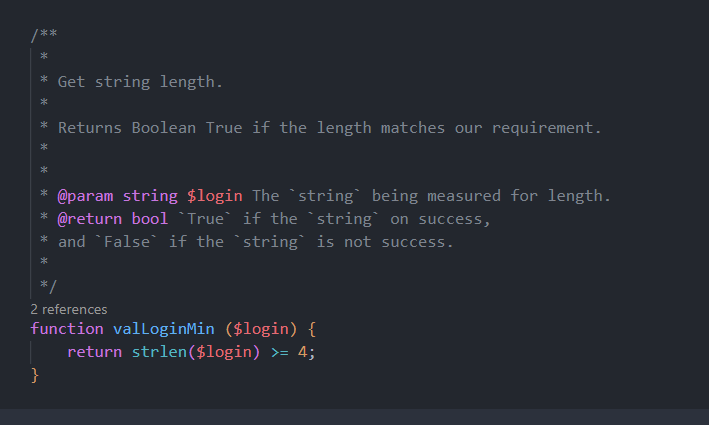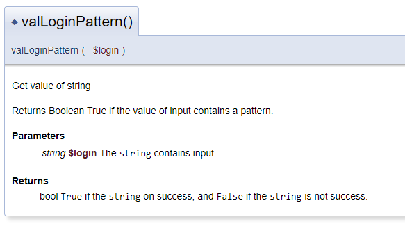 Budete muset popsat své vlastní funkce, které používáte. Například, jedna z mých funkcí kontroluje zadané uživatelské jméno (login). Děláme to proto, abychom později vygenerovali správný kód. Je potřeba napsat, co funkce dělá, jaké parametry obsahuje a co vrací.