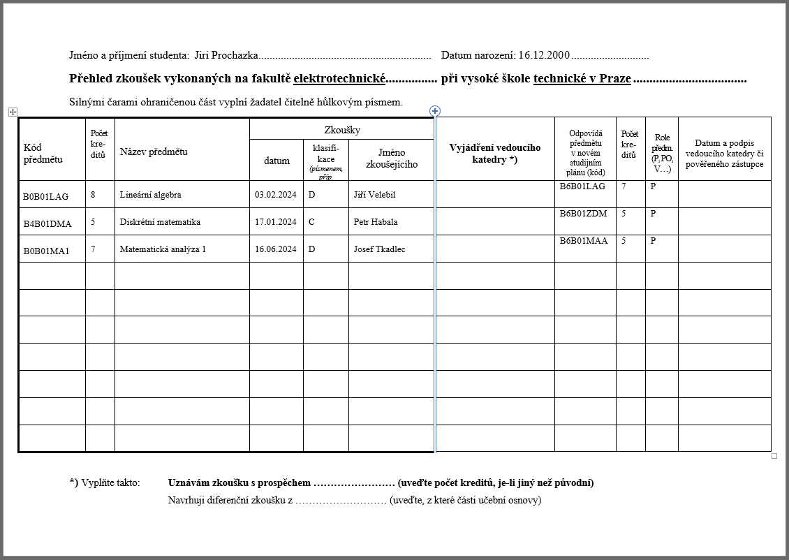 Обычно узнание предмета делает руководитель кафедры (чеш. Vedouci katedry). Вы пишете заявление, он одобряет. Потом уже одобряет продекан.