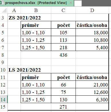 Размер стипендии S (крон/семестр) указан в следующей таблице, в которой k — категория, Φ — прумер, а X — основа стипендии: